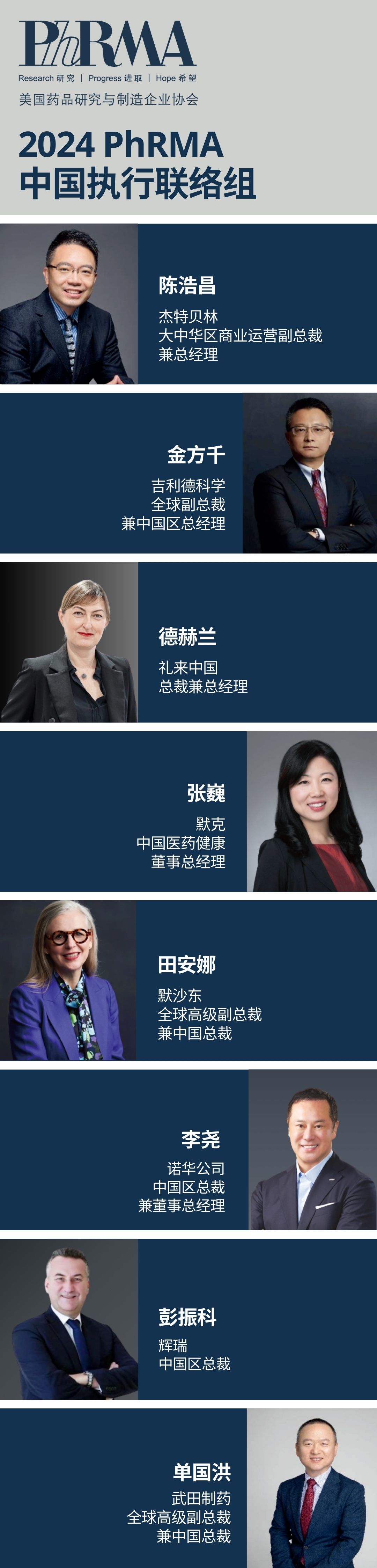 中国执行联络组由PhRMA成员企业的中国区总经理组成。作为PhRMA中国办公室与成员企业在中国的重要桥梁和纽带,中国执行联络组将继续对中国相关的事务提供关键见解,并指导中国办公室实施PhRMA既定目标和优先事项,为中国生物医药创新生态系统的发展建言献策。