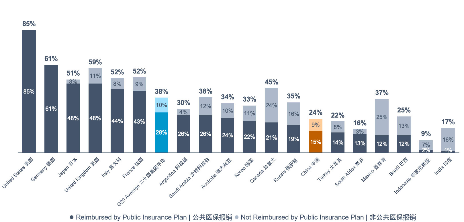 即便如此,过去10年在全球推出的新药中,在中国可获得的只有24%,而美国的这一比例为85%,二十国集团的国家平均为38%。此外,2012年至 2021年期间,中国的国家医保药品目录下可报销的全球推出之新药的比例仅为15%。因此,在提高患者的创新药物可及性方面,中国仍有很大潜力。
