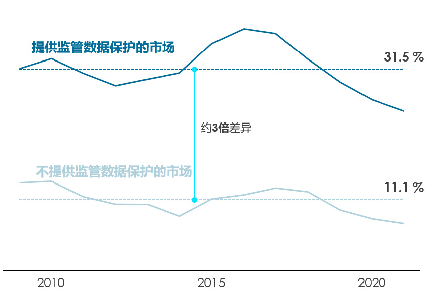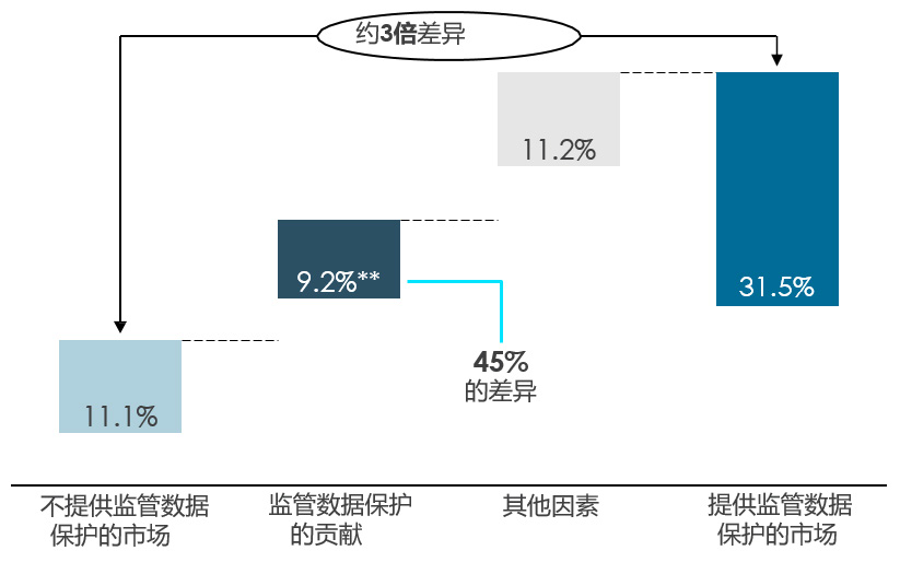 监管数据保护所提供的临床数据独占期为研发的投入和新药的推出提供了有力的激励。尤其是对于生物制品类无法被专利充分保护的药物,监管数据保护尤其重要。如图3和图4所示,提供监管数据保护的市场平均有31.5%的全球药物可供患者使用,而不提供监管数据保护的市场这一比例则为11.1%。在这一差异中,监管数据保护在药物可及性方面的贡献与其他因素相比高了9.2%,相当于该差异的45%。