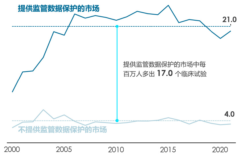 监管数据保护还与更多的临床试验活动相关。不提供监管数据保护的市场平均每百万人口有4个临床试验,而提供监管数据保护的市场平均每百万人口则有21个临床试验(图5)。对监管数据保护的孤立效应的评估显示,因为有监管数据保护,每百万人口临床试验增加2.8个(图6)。这相当于在不提供监管数据保护的市场的临床试验基线数量基础上,增加了70%。以日本和克罗地亚为例,两个国家的临床试验人数均在引入监管数据保护后增加,每百万人口分别增加了3.5和1.5个临床试验。